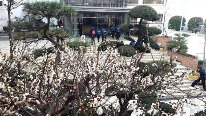 正門前の紅梅、白梅の花がまもなく満開になります!春がもうそこまでやって来ています。