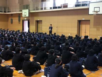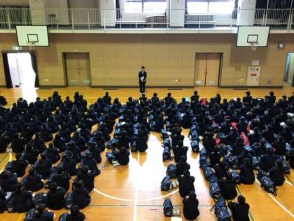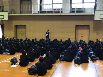 テスト終了後、1.2年生の部活動集会が体育館で行われています。