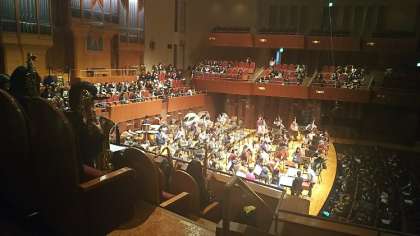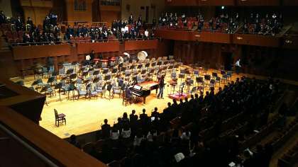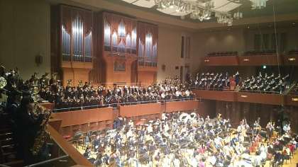 本日昼から、17日に行われるはじめましてオーケストラの練習に参加してきました。代表生徒は大阪フィルハーモニー管弦楽団の方と共に舞台へ、一般生徒は客席で全体合奏です。最後は歌の練習でした。