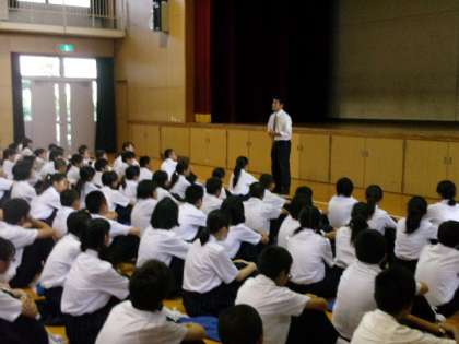 また、2学期は体育大会、合唱コンクール、文化発表会等、学年、クラスがまとまって取り組んでいく行事がたくさんあります。1年生は入学当初から、班活動を中心に仲間づくりに取り組んできました。これまでの成果を生かし、みんなの力で素晴らしい行事にし、その行事を通して、さらに班活動を充実していこう!と先生方からの呼びかけに、生徒の皆さんは真剣なまなざしで聞いていました。