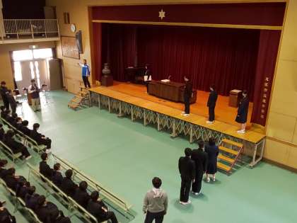 小野先生より1組の生徒を見本に証書授与時の立ち振舞いについての説明が行われています。