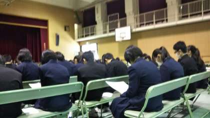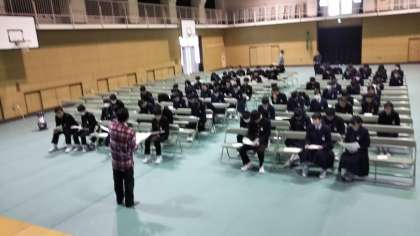 卒業式の練習を終えて、進路指導主事の金田先生から、月曜日に迫った公立一般選抜受検についての諸注意がありました。