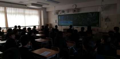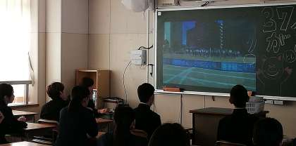 5組では、担任の先生が作成された記念映像を視聴しています。