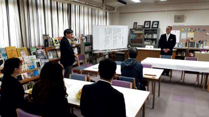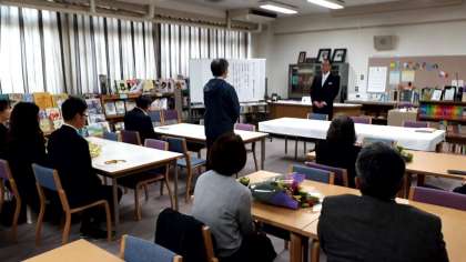 引き続き、図書室でPTA・なにわ会の皆様との離着任式を行い、長畑教頭、西邨先生のご昇任をお祝いしていただきました。