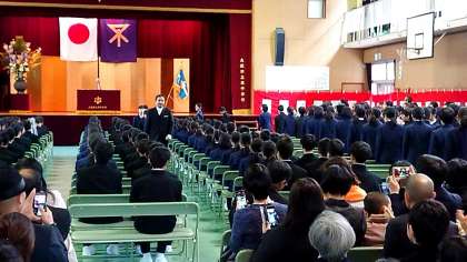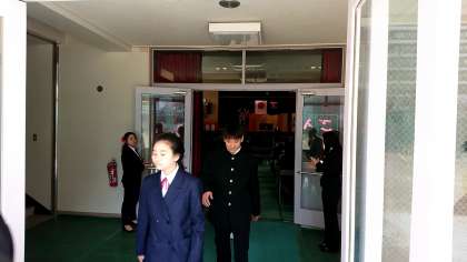 新入生が入学式を終えて退場しています。みんないい表情です!1組の退場です。