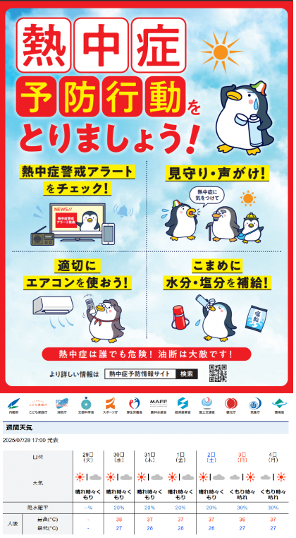 今日・明日の最高気温は38度と猛暑日の予報です。朝から厳しい暑さです。くれぐれも、こまめな水分補給と声かけを励行するなど、熱中症予防行動をとって過ごしましょう。