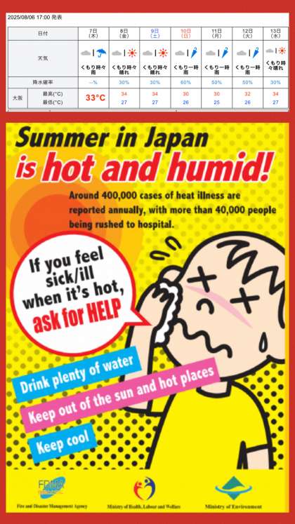 8月7日(水)、夏休みの折り返しを迎えました。今日は久しぶりの雨の予報です。各地の水不足が少しでも解消されることを願います。最高気温は33度、連続猛暑日は、一旦ストップ。しかし、蒸し暑さが残りますので、引き続き、熱中症予防行動を心がけましょう。
