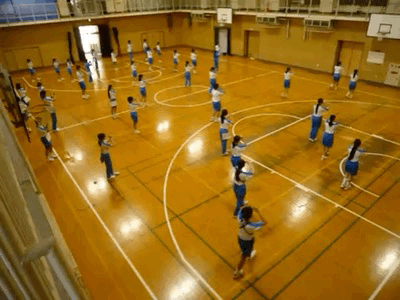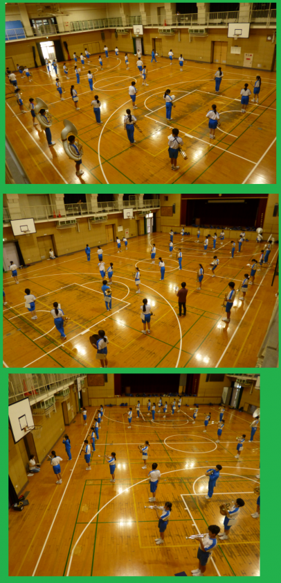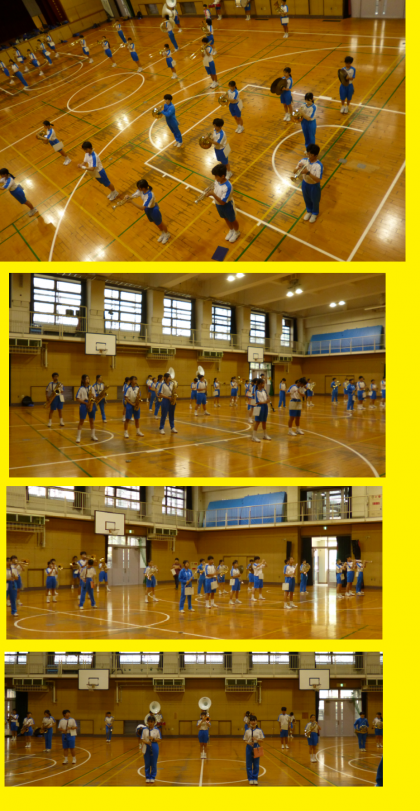 吹奏楽部が、体育大会で披露するマーチング演奏に向けて、体育館で練習に励んでいます。顧問の先生が作成した動きのシートを片手に、動きの確認。楽器をもって動きの確認、演奏しながらの動きの確認とスモールステップで練習が進みます。