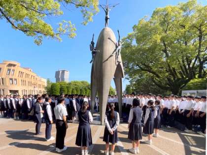 現3年生の東中38期生が、6月に広島平和記念公園にて行った平和セレモニーの時の写真を使いました。また、全員で合唱した歌は以下をクリックするとご視聴いただけます。↓↓
