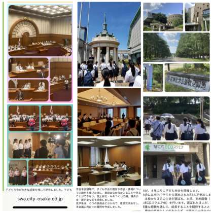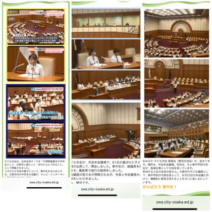 『おおさか子ども市会(中学生市会)』に3人が参加します。今日が事前学習、本会議は市長もご出席予定で8月19日(火)に予定されています。7人がエントリーしていましたが、全市から多数の応募があり、3人の選出となりました。選出された皆さんおめでとうございます。皆さんは、選ばれなかった皆さんの分まで積極的に参加してきましょう。そして、この経験を2学期以降の生徒会活動に活かしましょう。