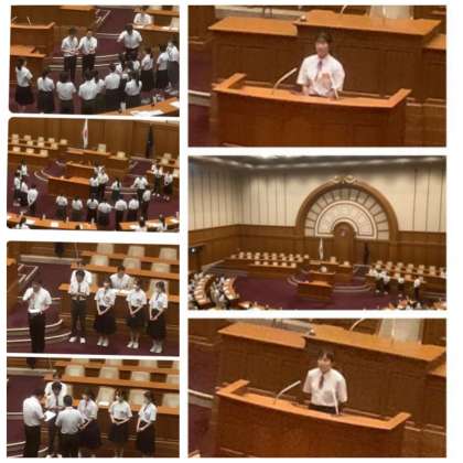 本日は、本校の生徒を含む12人の子ども議員の代表者が本会議で質問・意見を発表し、それに対して市長が1問ごとに答弁を行います。また、市会議長、副議長からあいさつがあり、各常任委員長からそれぞれ感想等のコメントがあります。