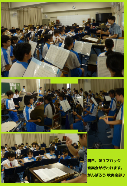 本校は、明日の吹奏楽部がブロック音楽会E地区に出場。東中サウンドを相愛高校のホールに響かせることでしょう。今日の練習では、しっかり仕上がっていたので、楽しみです。
