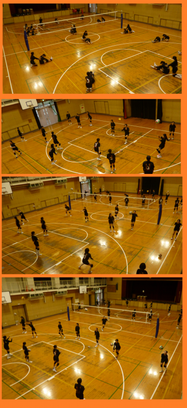 体育館では、女子バレーボール部が全面での練習です、3年生が抜けて、新チームになっても30人を超えるメンバーが、けが防止のストレッチをしっかりとしてからボールを使っての練習です。