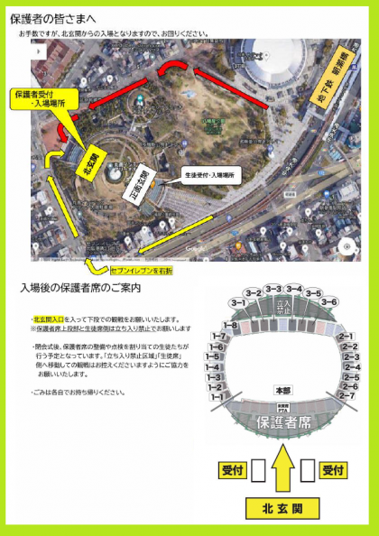 ※保護者の皆様は、北玄関入口を入って下段での観覧をお願いいたします。