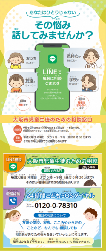 大阪市立の学校に通う児童・生徒のみなさんが利用できる相談窓口について、お知らせします。電子メールや FAX、電話による相談窓口は、「相談窓口についてのお知らせ」のとおりです。また、LINEでも相談を受け付けています。「LINEによる相談窓口利用案内」をご覧ください。もし、いじめや友だち関係、学校生活、家庭生活などについて悩みがあるときは、あなたにとって一番相談しやすい方法で相談してください。