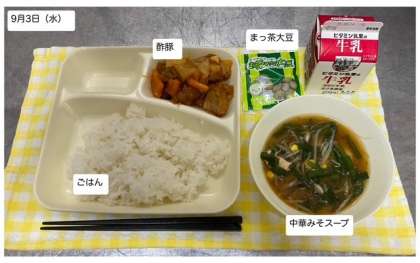 今日の献立は「酢豚・中華みそスープ・まっ茶大豆・ごはん・牛乳」です。残さず、しっかりいただきましょう。