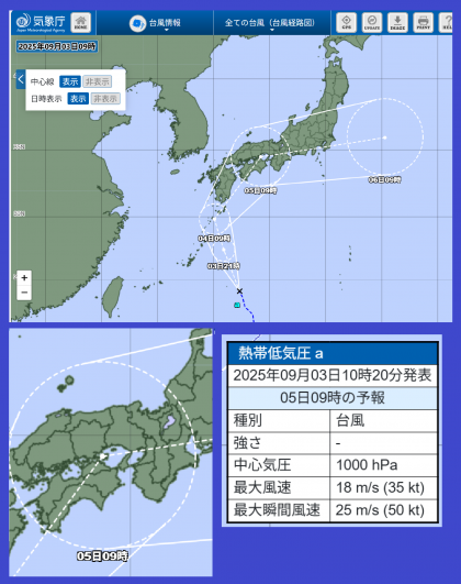 午前9時現在、熱帯低気圧が北上しており、今夜には台風に発達する可能性があります。明日4日はさらに北上し、5日(金)は本州付近を東に進み、6日(土)は温帯低気圧に変わるようです。