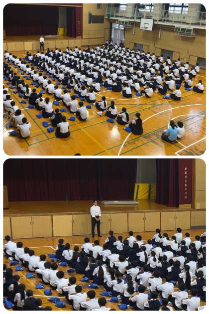 朝の2年生の学年集会で、教育実習中の先生から、中学時代の思い出を題材に2年生にエールが送られました。実習生の研究授業は明日大学の先生を招いて予定されています。台風の進路がら気がかりですが、実習の成果が存分に発揮された授業になることを期待しています。