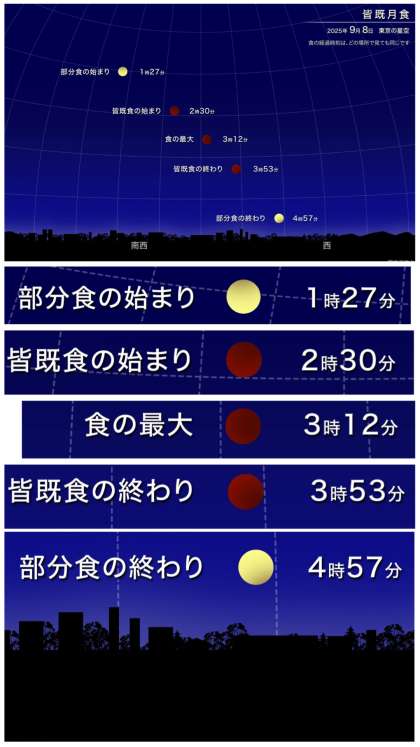 ※月食:1時27分〜4時57分、皆既食:2時30分〜3時53分、食の最大は3時12分です。
