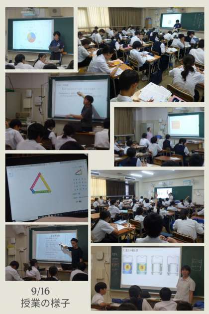 最後は1年生の理科の授業の様子です。濃度の異なるビーカーの様子から、どこに違いを見破るポイントがあるか、生徒たちがどんどん発表して考える機会を持っていました。水溶液の色の濃さの違いや、屈折率の違いからわかることについて、理解を深めていました。