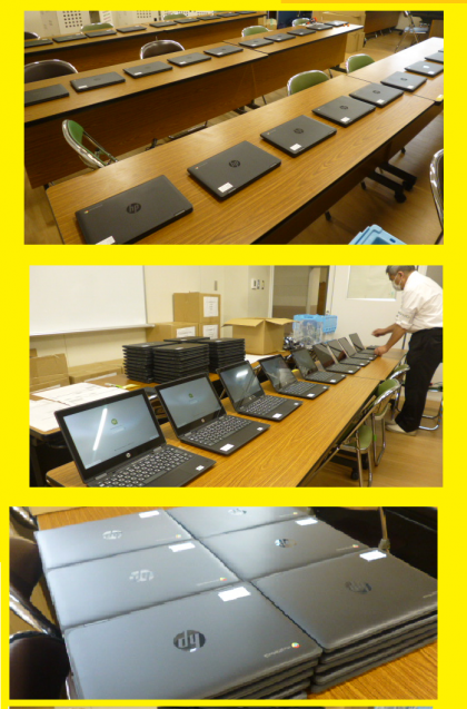 新しい学習者端末が『約850台』、大阪市の学校でたぶん1番に搬入されました。今日は、その初期設定のために、スタッフが10名ほどお越しになり、生徒の皆さんが使えるように下準備をしていただいています。