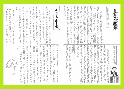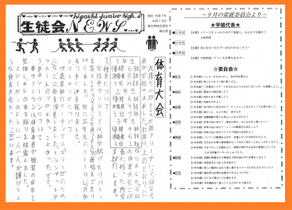 今月号では、表面に前期最後の常置委員会からのインフォメーションと「体育大会」の記事が、裏面には『生徒会選挙』と『子ども市会』についての記事が掲載されています。ぜひ、ご一読ください。