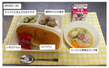 今日の献立は「鶏肉のバジル焼き・ベーコンと野菜のスープ煮・キャベツときゅうりのサラダ・コッペパン・いちごジャム・牛乳」です。残さず、しっかりいただきましょう。