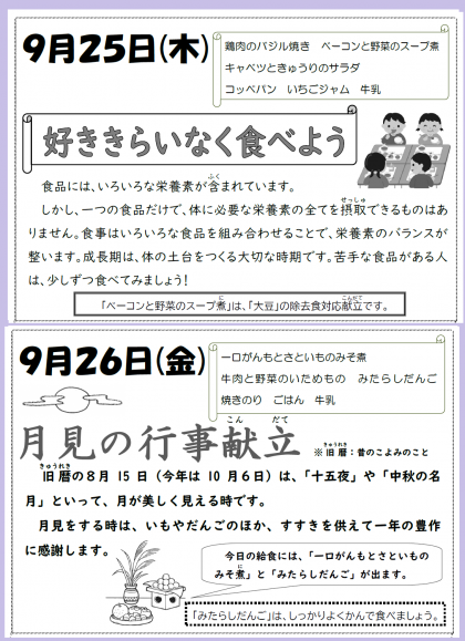 明日は月見の行事献立として「一口がんもとさといものみそ煮・牛肉と野菜のいためもの・みたらしだんご・焼きのり・ごはん・牛乳」が提供されます。お楽しみに。