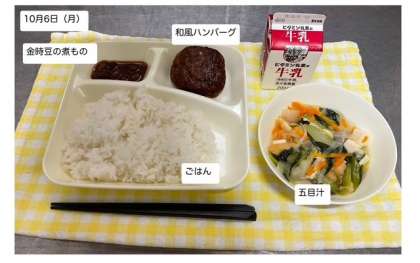 今日の献立は「和風ハンバーグ・五目汁・金時豆の煮もの・ごはん・牛乳」です。残さず、しっかりいただきましょう。