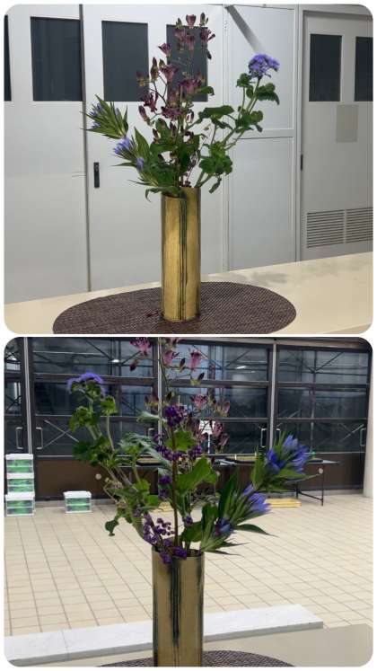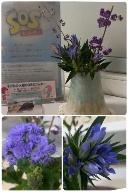 玄関ホールに「ホトトギス・ムラサキシキブ・リンドウ・アゲラタム」を、職員室前には「ムラサキシキブ・リンドウ」を生けていただきました。いつもありがとうございます。