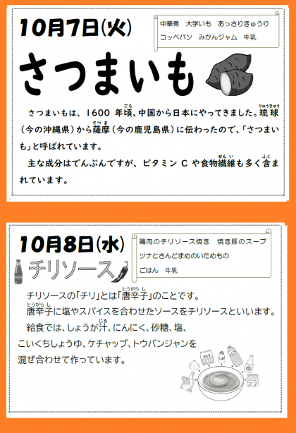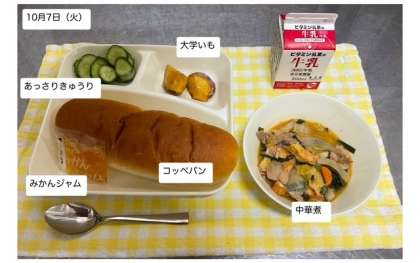 今日の献立は「中華煮・大学いも・あっさりきゅうり・コッペパン・みかんジャム・牛乳」です。残さず、しっかりいただきましょう。