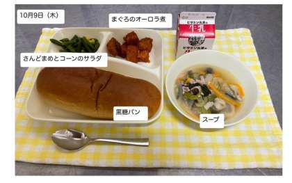 今日の献立は「まぐろのオーロラ煮・スープ・さんどまめとコーンのサラダ・黒糖パン・牛乳」です。残さず、しっかりいただきましょう。