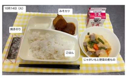 今日の献立は「みそカツ・じゃがいもと野菜の煮もの・焼きのり・ごはん・牛乳」です。残さず、しっかりいただきましょう。