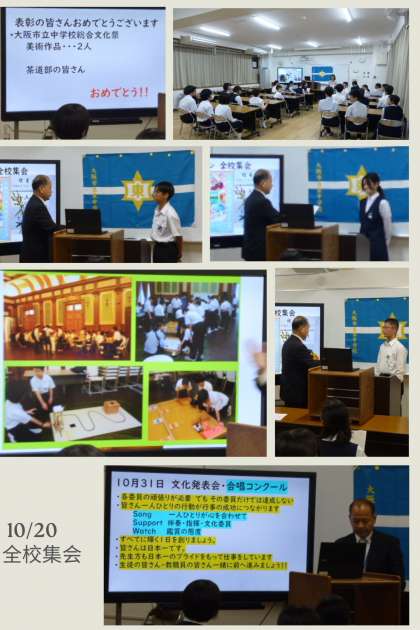 土曜、日曜に中央公会堂で行われた、大阪市中学校総合文化祭で掲示された作品を美術の授業で製作した生徒30名あまりを代表して男女それぞれ1名が、またお点前を披露してくれた茶道部15名を代表して3年の部長が表彰されました。3年生はこれで一区切りとのことですが、部活動の最後に表彰を受けて、よい締めくくりとなりました。