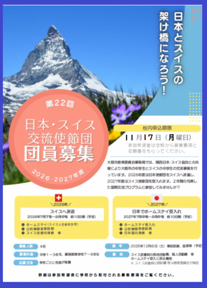さて、日本・スイス青少年交流使節団事業による、第22回(令和8年度)スイス派遣団員募集が大阪市教育委員を通じて届きましたのでお知らせします。