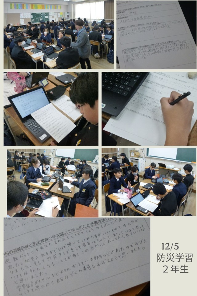 2年生では、防災学習を調べ学習中心に実施しています。広域避難場所や一時避難場所について学んだあと、地図で確認しながら、通学路との位置関係を確認。そのあと避難に必要なものを班の仲間と話し合いを通じて確認していきました。記録と感想を書き込んだ用紙には、子どもたちの字がびっしり書かれています。中学生が防災意識を高く持ってくれることは、地域の人たちの安全にも大きく寄与します。この学びが生きていきますように。