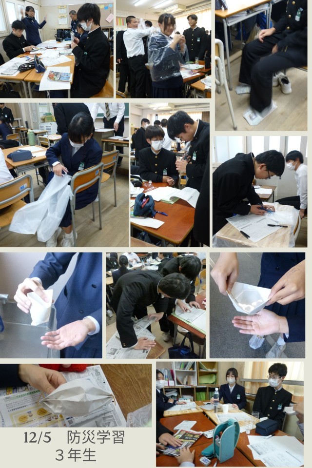 3年生では、避難生活が始まった際に役に立つ、新聞紙やキッチンペーパーを活用した防災グッズの製作体験を行っていました。新聞紙では、簡易スリッパを作成しています。体育館の中など、冷たい床や、ほこりっぽい床から足を守ることができそうです。ごみ袋からは、ポンチョづくりを行いました。これなら何とか急場をしのぐことができそうです。コピー用紙からはコップを、キッチンペーパーからはマスクを製作しました。いずれも持続的に使用することは難しそうですが、いざ必要となった時に、身近なものから用意ができて、役に立つものとしては、十分なものと感じました。