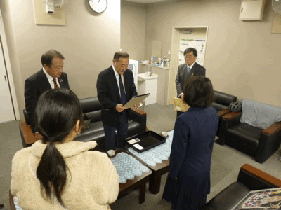 本日は、主催者を代表して、ライオンズクラブ国際協会から幹事さまをはじめ4名の方々が、セレモニーのためにお越しいただきました。また、応募した皆さんにも記念品をいただき、顧問の先生が代表して受理しました。主催者の皆さま、ありがとうございました。部員の皆さん、来週、集会で伝達しますのでお待ちください。