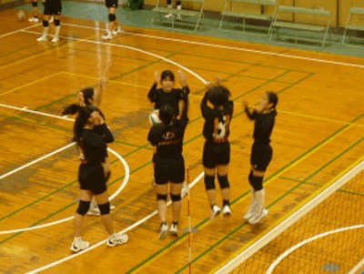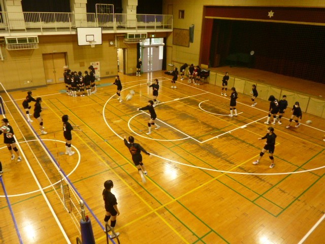 女子バレーボール部が、体育館で練習試合をしています。両チームとも元気いっぱいで、試合は大接戦。体育館には、両チームのかけ声が響いています。
