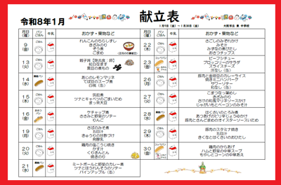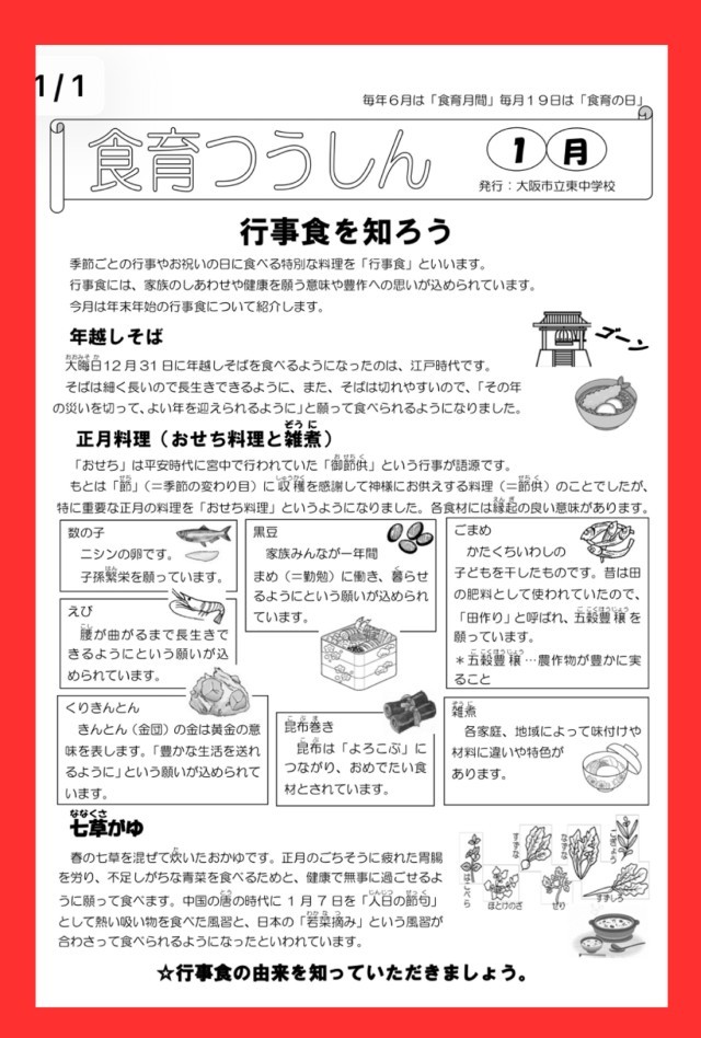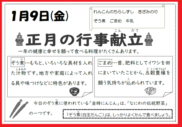 今日から給食が提供されます。本日のメニューは、お正月献立として『れんこんのちらしずし・きざみのり・そう煮・ごまめ・ 牛乳』が、提供されます。お楽しみに。