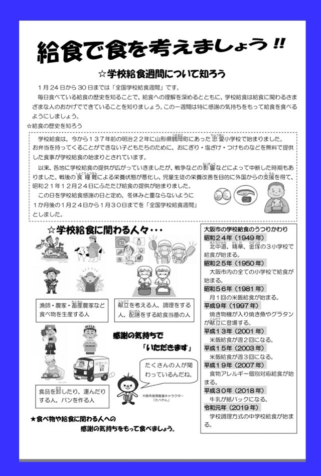 本日から、マスクとランチョンマットの用意をお願いします。また、給食当番の人はエプロンと三角巾(バンダナ)の用意もお願いします。ご理解とご協力をよろしくお願いします。