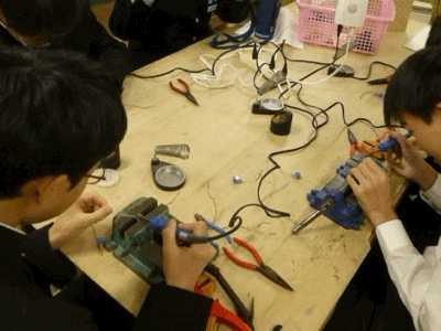 技術部は、全国大会に出場するロボットの最終チェック。また、そのチームだけでなく、それぞれにロボットのブラッシュアップやチューニングに取り組んでいます。手書きの設計計画書をチームで共有したり、はんだ付けの作業をしたり、それぞれが目標を決めての活動です。