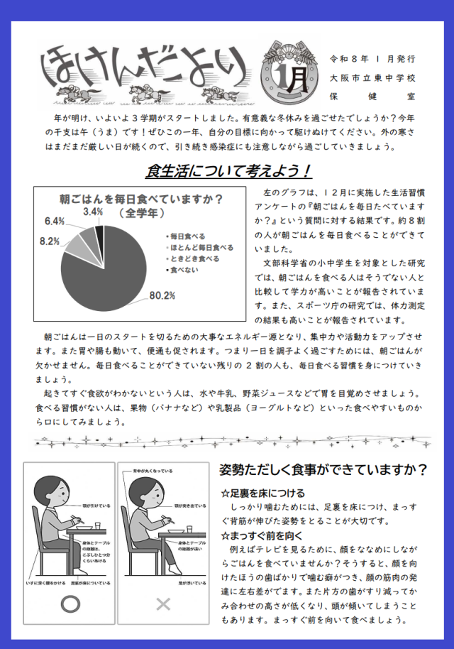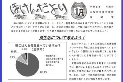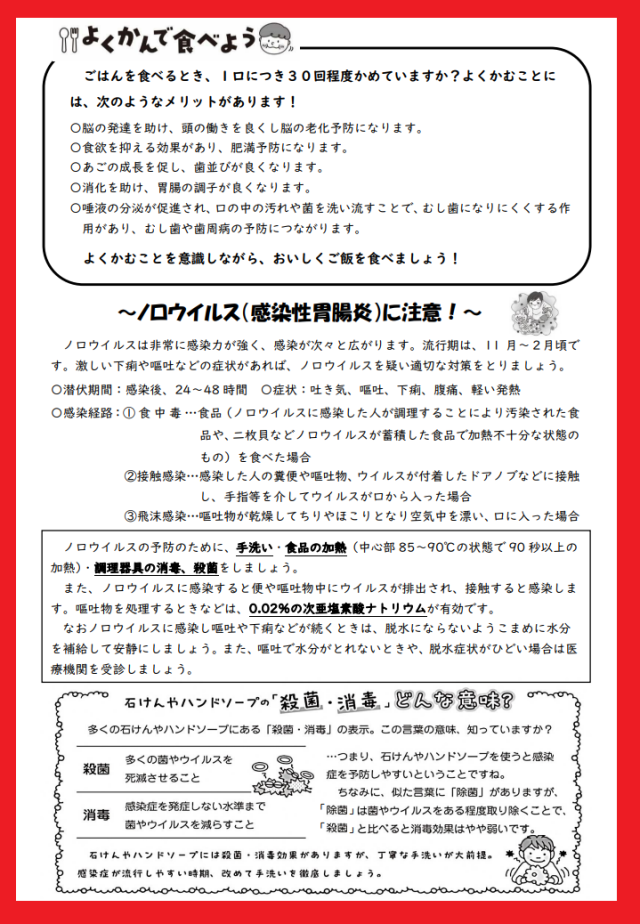今月のほけんだよりでは、表面では「食生活について考えよう!」「姿勢正しく食事ができていますか?」、裏面には「ノロウイルスに注意!」の見出しで記事が掲載されています。ぜひ、ご一読ください。