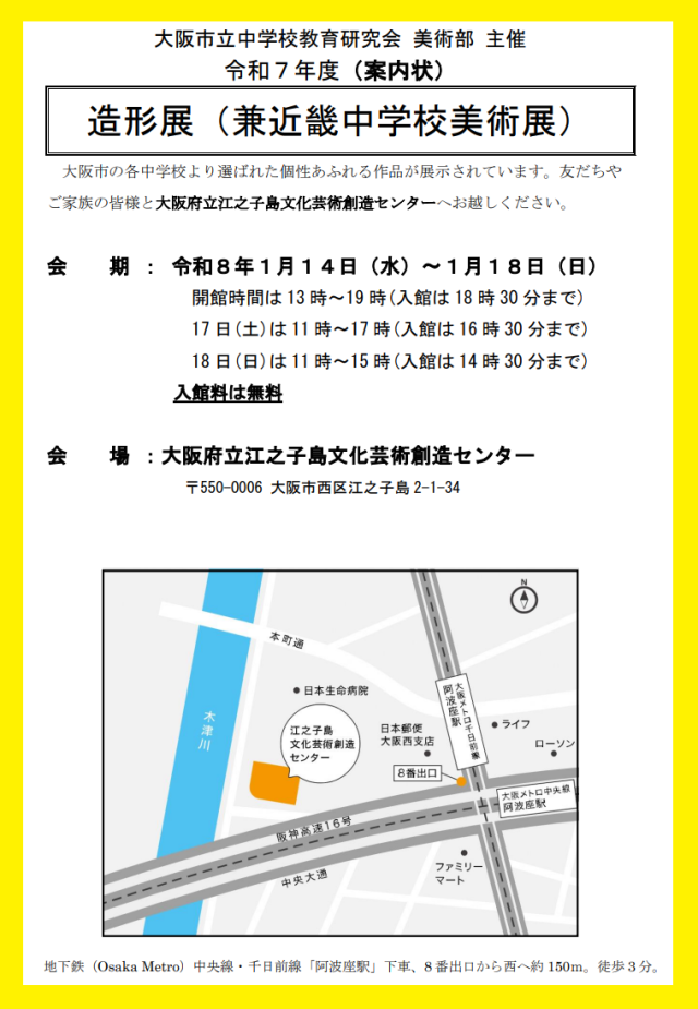 『第47回大阪市立中学校造形展』・『第66回近畿中学校美術展』が、西区阿波座の enoco【大阪府立江之子島文化芸術創造センター】を会場に開催されています。 主催は大阪市立中学校教育研究会美術部・近畿中学校美術教育連盟、開館時間は次の通りです。本校生徒の作品も展示されています。 大阪市・近畿一円の秀作をぜひご鑑賞ください。
