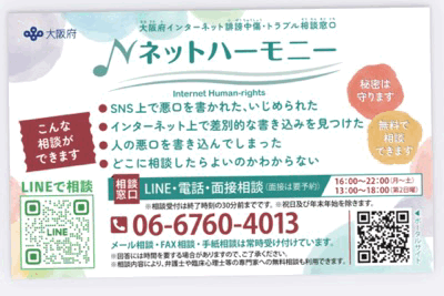 大阪府インターネット誹謗中傷・トラブル相談窓口「ネットハーモニー」は、インターネット上の誹謗中傷やトラブルに関する相談窓口です。