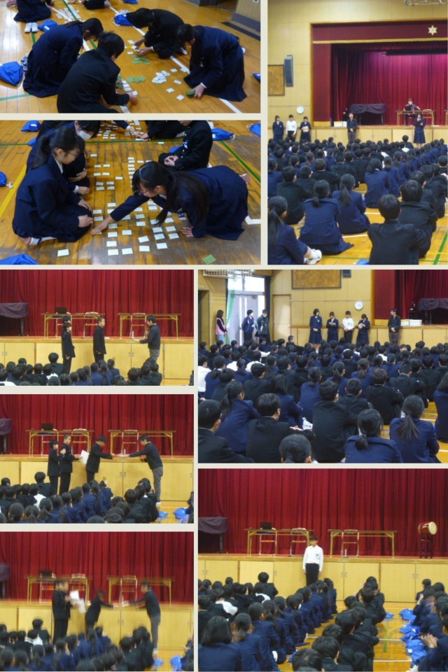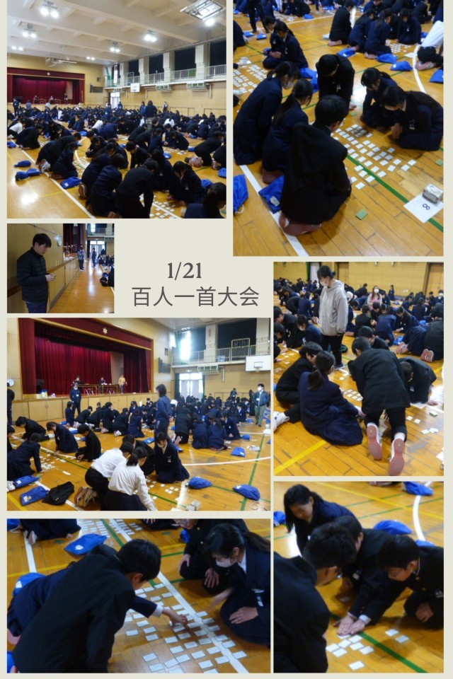 午後からは1年生が百人一首大会を実施しています。8クラスともなると子どもたちの対戦会場も体育館いっぱいに設置しています。12月からこれまで練習した成果を子どもたちはしっかり発揮します。お気に入りの句は上の句で、また一時決まりの句には飛びつくようにしてたくさんの生徒が札を取り合っています。外国から中学校にやってきた生徒も取り札がひらがなであることもあって、善戦しています。