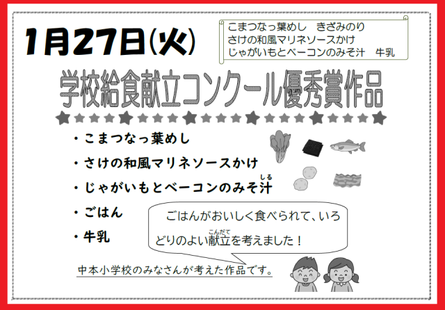 本日の給食では、『豚肉と金時豆のカレーライス・焼きミニハンバーグ・サワーソテー・和なし(缶)・牛乳』が提供されます。しっかりといただきましょう。今日も、星の形などに型抜きしたラッキー『にんじん』は入っています。見つけた人には、幸運なことが訪れるといいですね。明日は、学校給食献立コンクール優秀作品の『こまつなっ葉めし・きざみのり・さけの和風マリネソースかけ・じゃがいもとベーコンのみそ汁・ごはん・牛乳』が提供されます。お楽しみに!!