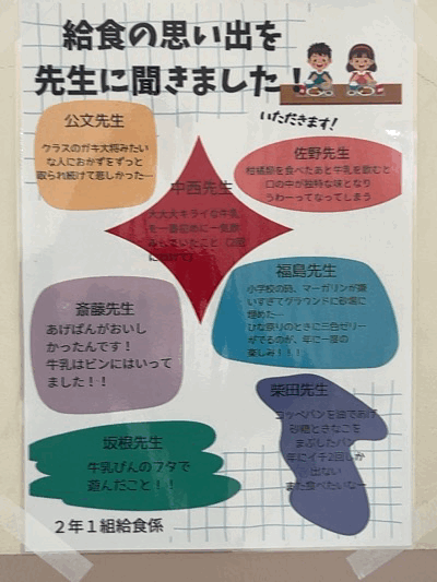 3枚目の写真のスライドショーは、各クラスの給食係が創意工夫して作成してい掲示物です。