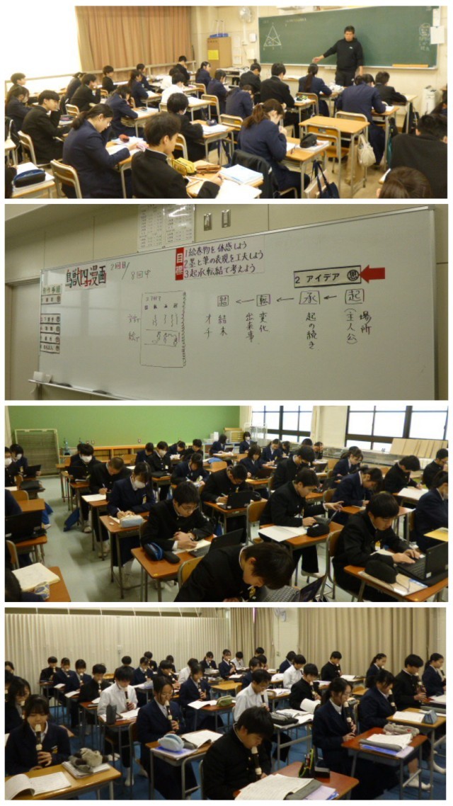 2年生の授業です。教室でも、美術室・音楽室でも、集中して学ぶ姿があります。
