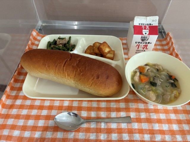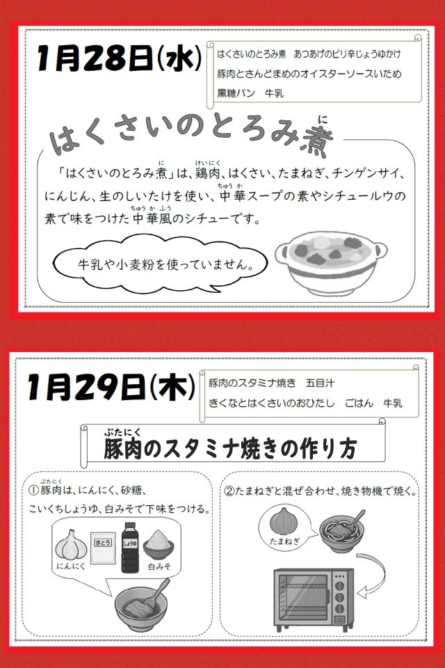 明日は『豚肉のスタミナ焼き・五目汁・きくなとはくさいのおひたし・ごはん・牛乳』が提供されます。お楽しみに。